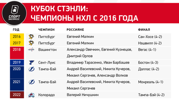 Активная серия чемпионств россиян в НХЛ длится с 2016 года. В последний раз наши не поднимали кубок в 2015-м, когда в финале «Чикаго» взял верх над «Тампой» (в составе «Лайтнинг» в том сезоне выступали Андрей Василевский, Никита Кучеров, Владислав Наместников и Никита Нестеров). С тех пор было несколько по-настоящему крутых лет.