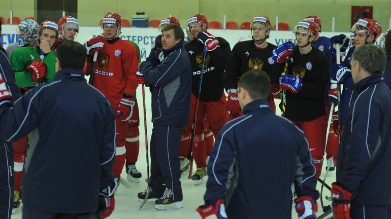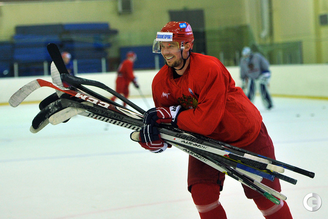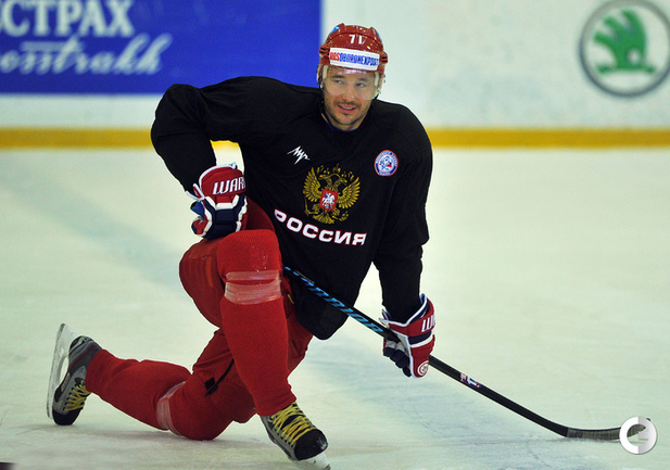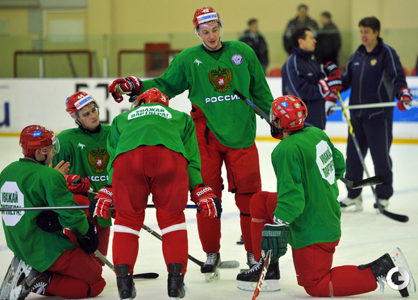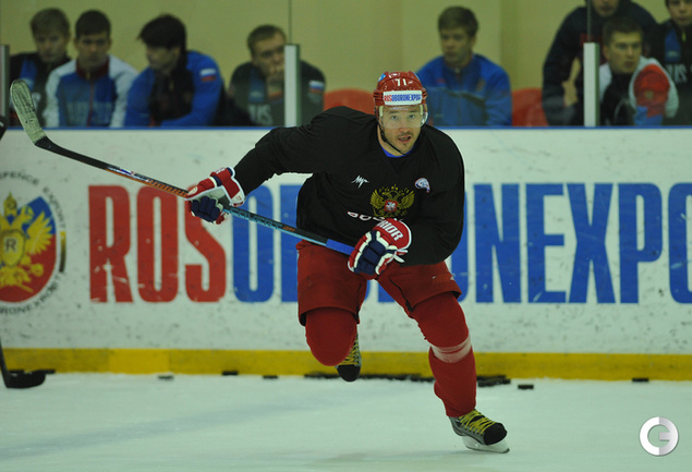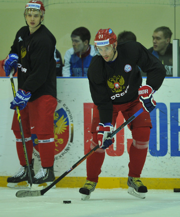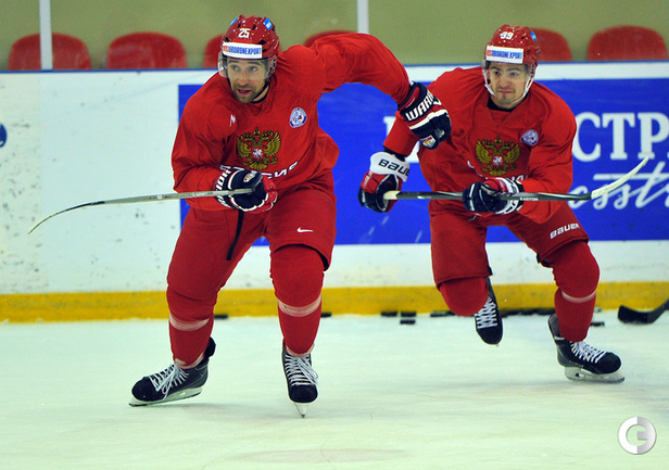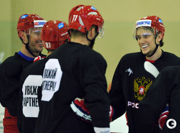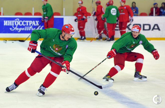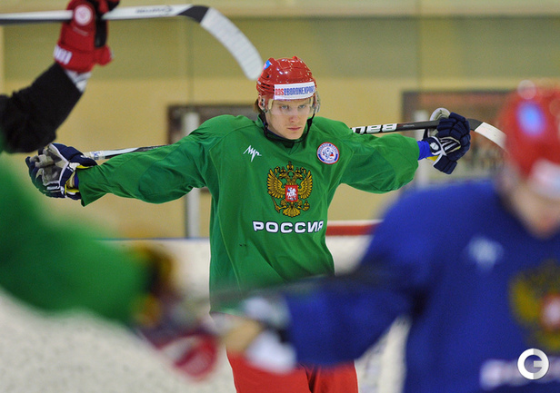 Хоккеисты сборной России на олимпийской базе в подмосковном Новогорске готовятся к матчам Кубка Первого канала, которые пройдут в Сочи с 18 по 21 декабря. В тренировке из-за травм не приняли участия Артемий Панарин и Виктор Тихонов. Также на лед не вышел Александр Радулов, проходящий МРТ-обследование. Фото - Александр Федоров, "СЭ"