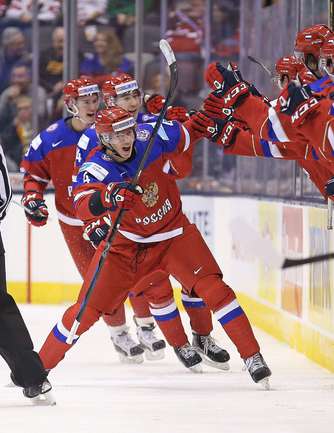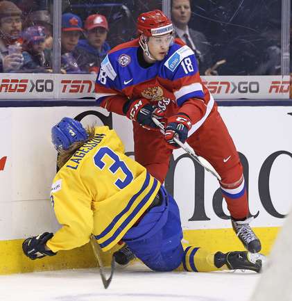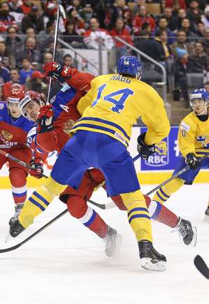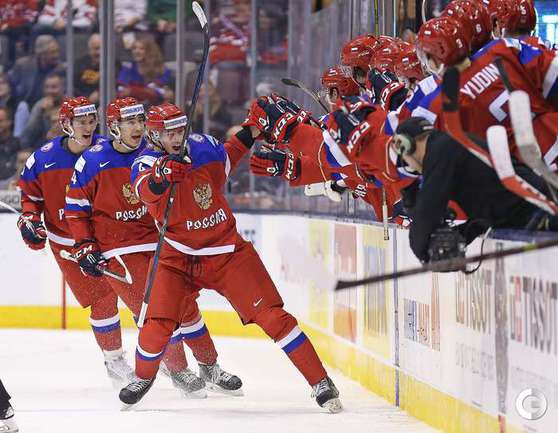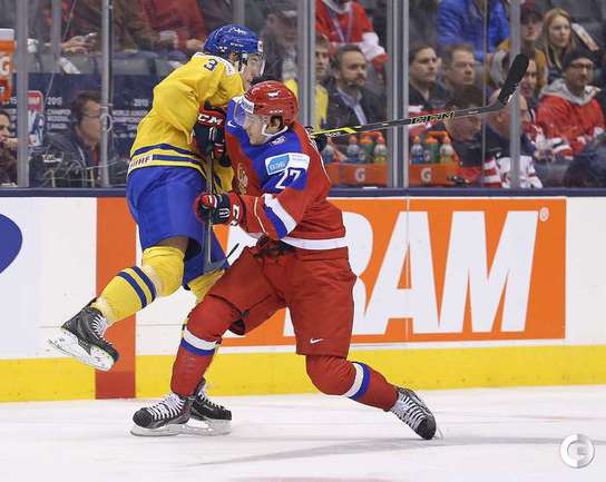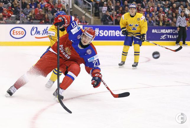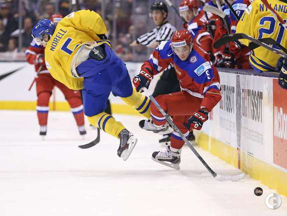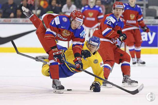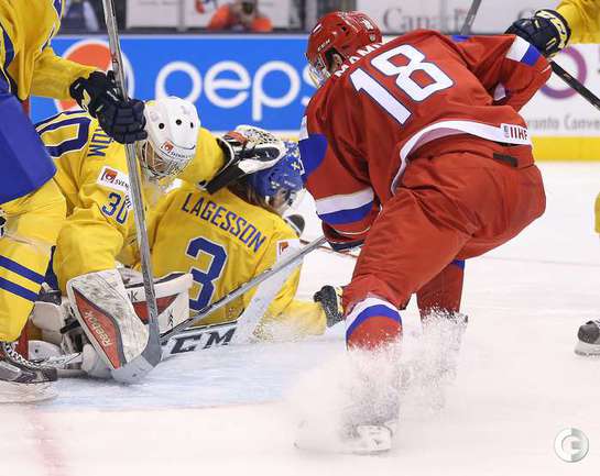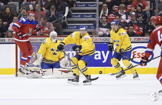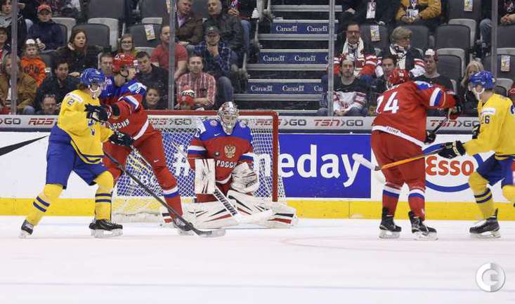 Торонто (Канада). Молодежный чемпионат мира. 1/2 финала. Швеция – РОССИЯ – 1:4 (0:0, 0:2, 1:2). Голы: Шаров – 3 (Голышев, Дергачев), 31:18 – 0:1. Пайгин – 1 (бол., Валиев, Каменев), 32:50 – 0:2. Шаров – 4 (Брюквин, Мамин), 41:31 – 0:3. Валлмарк – 4 (Бродески, Кемпе), 51:30 – 1:3. Мамин – 2 (Фищенко, Брюквин), 52:39 – 1:4. Фото AFP