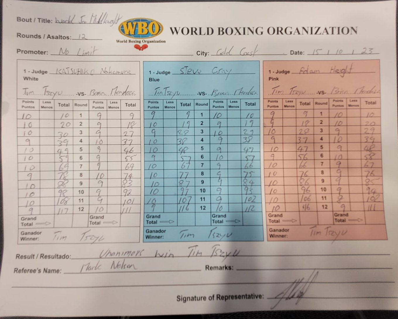 Тим Цзю одержал победу единогласным решением судей над американцем Брайаном Мендосой. Защитил титул чемпиона мира по версии WBO в среднем весе и остается непобежденным боксером с рекордом 24-0.
