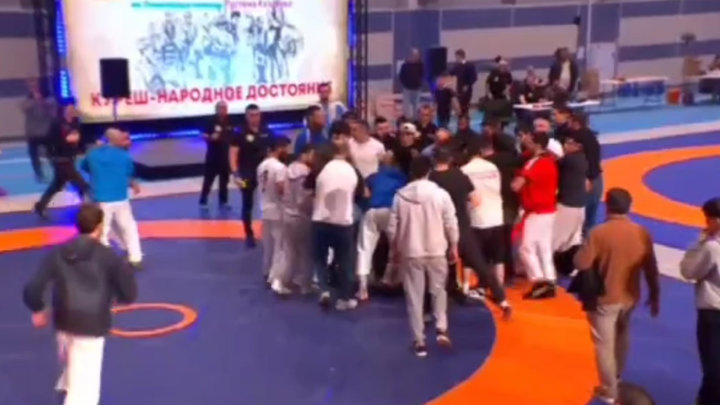 В какой-то момент эмоции участников вышли из-под контроля, и один из разгоряченных борцов спровоцировал драку прямо на ковре. К потасовке быстро подключились и другие участники турнира.
