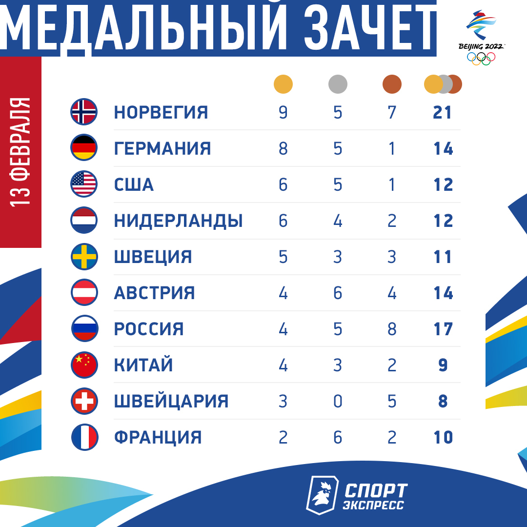 У команды ROC (ОКР) в медальном зачете Пекина-2022 — 4 золота и всего 17 наград. Российская сборная идет на седьмом месте. При этом по общему числу медалей впереди только Норвегия (21 всего и 9 золотых).