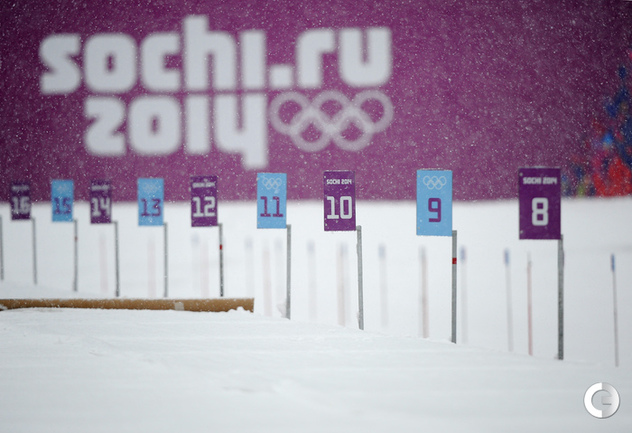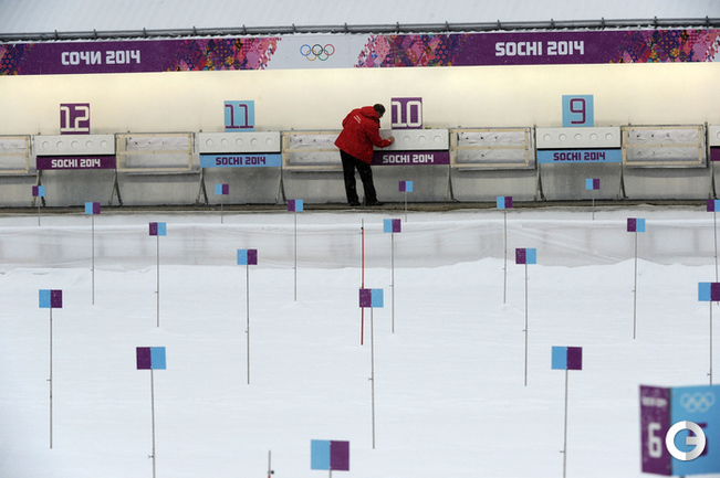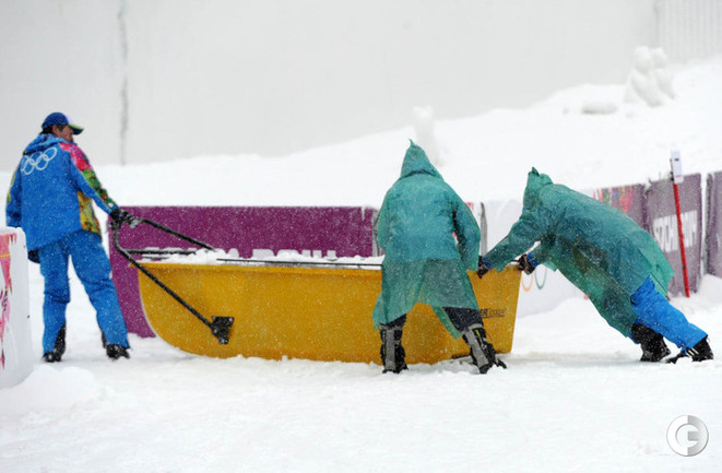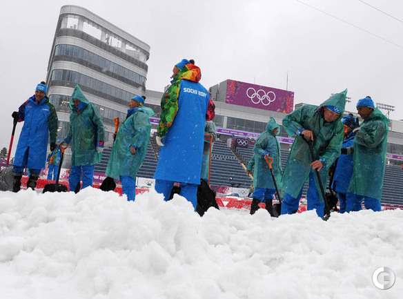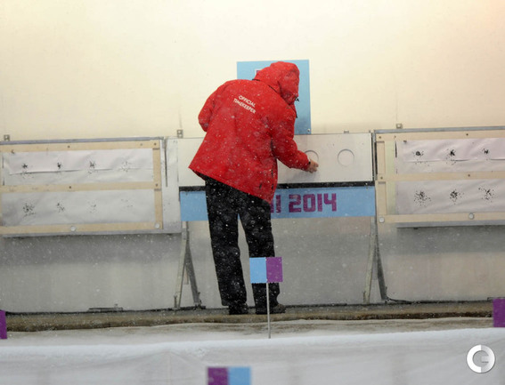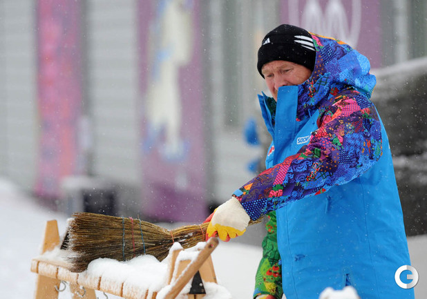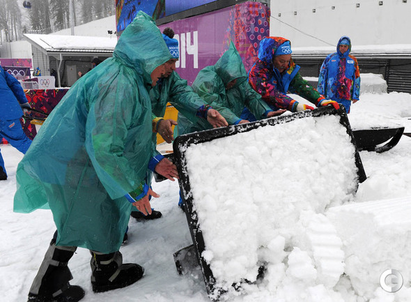 После тумана на лыжно-биатлонные комплекс "Лаура" обружился снегопад. Сотрудники стадиона изо всех сил стараются подготовить трассу к мужскому мас-старту. Фото - Федор Успенский, "СЭ"
