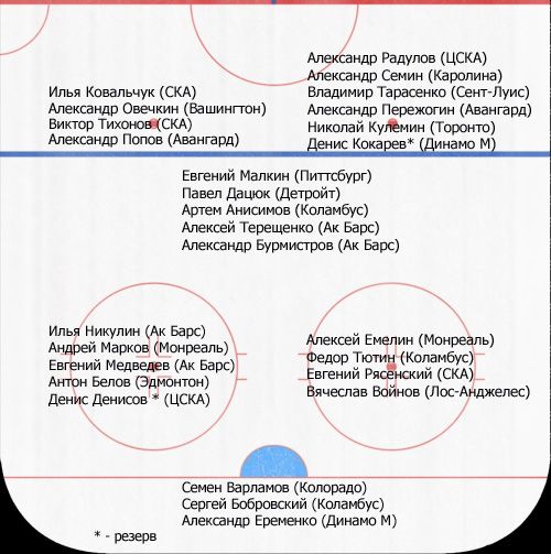 За игру Еременко очень трквожно - в этом году он совсем не тот, что был раньше. Пожалуй, среди голкиперов: Варламов и Гарипов. Защитники: Никулин, Емелин, Тютин, Марков, Чудинов, Медведев, Белов, Кольцов, Войнов, нападение: Ковальчук-Дацюк-Овечкин, Мозякин-Малкин-Зарипов, Тихонов-Анисимов-Радулов, Попов-Терещенко-Прохоркин, Карпов, Макаров?, Миловзоров?