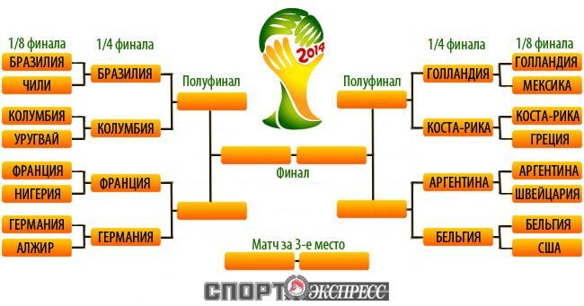 По итогам матчей 1/8 финала (Бразилия - Чили - 1:1. Пенальти - 3:2; Колумбия - Уругвай - 2:0; Голландия - Мексика - 2:1; Коста-Рика - Греция - 1:1. Пенальти - 5:3; Франция - Нигерия - 2:0, Германия - Алжир - 2:1 д.в.; Аргентина - Швейцария - 1:0 д.в.; Бельгия - США - 2:1 д.в.) определись следующие пары 1/4 финала.