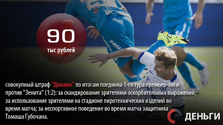 90 тысяч рублей - совокупный штраф "Динамо" по итогам поединка 1-го тура премьер-лиги против "Зенита" (1:2).