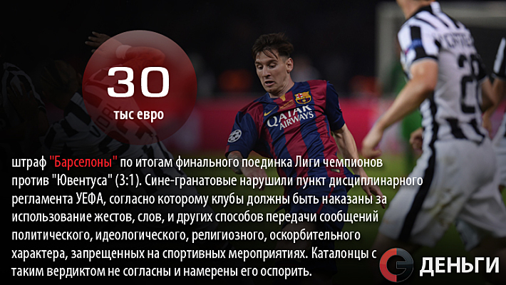 30 тысяч евро - штраф "Барселоны" по итогам финального поединка Лиги чемпионов против "Ювентуса" (3:1).