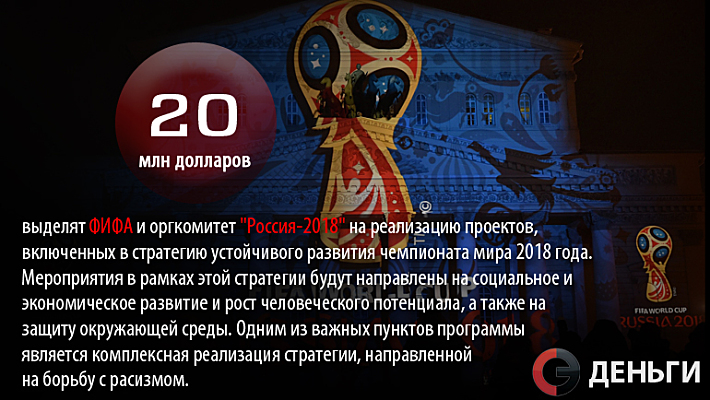 20 миллионов долларов выделят ФИФА и оргкомитет "Россия-2018" на реализацию проектов, включенных в стратегию устойчивого развития чемпионата мира 2018 года.