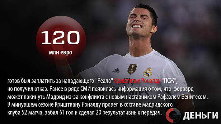 120 миллионов евро готов был заплатить за нападающего "Реала" Криштиану Роналду "ПСЖ", но получил отказ.