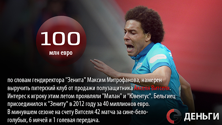 Не менее 100 миллионов евро (или около 6 миллиардов рублей по курсу ЦБ РФ) намерен выручить "Зенит" от продажи полузащитника Акселя Витселя. Именно столько составляет сумма отступных за футболиста.