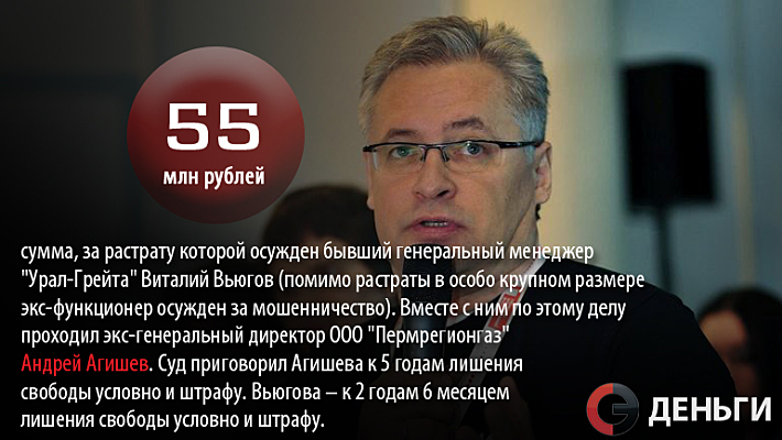 55 миллионов рублей - сумма, за растрату которой осужден бывший генеральный менеджер "Урал-Грейта" Виталий Вьюгов (помимо растраты в особо крупном размере экс-функционер осужден за мошенничество).