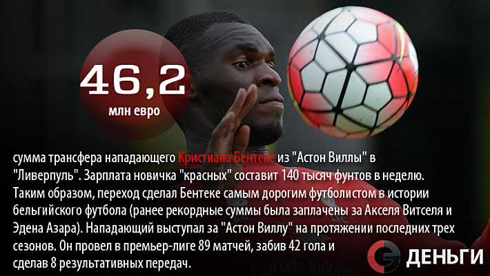 46,2 миллиона евро - сумма трансфера нападающего Кристиана Бентеке из "Астон Виллы" в "Ливерпуль".