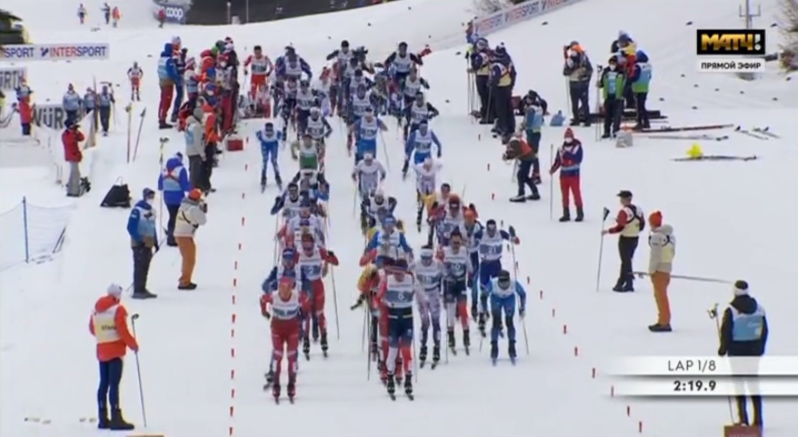 А вот и пошли россияне нагнетать! Червоткин убежал немного, а сразу за ним Большунов тащит группу.