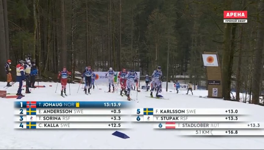 Все, переобуваются девушки. 11 секунд Сорина уступает Йохауг, до Андерссон — около семи секунд.