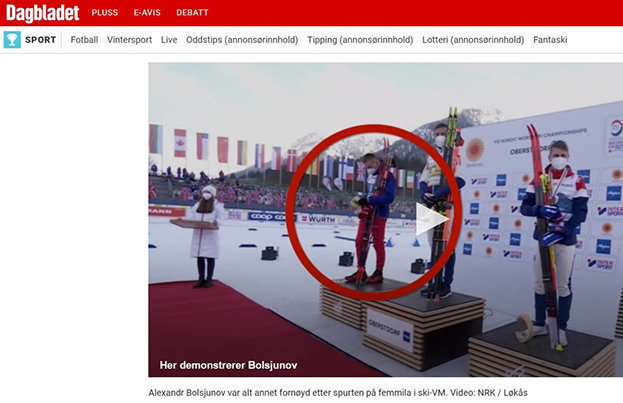 Журналисты Dagbladet особое внимание акцентировали на том, что Александр Большунов отказался надевать серебряную медаль на церемонии награждения. Публикация вышла под заголовком «Он отказался надевать медаль ЧМ», где в заглавном фото российских лыжник был обведен в красный круг, и видно, что свою награду он держит в руках.