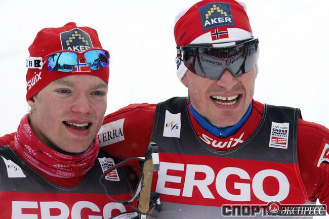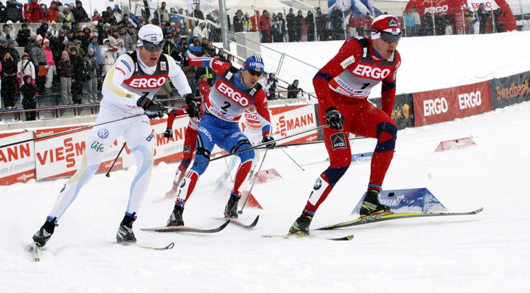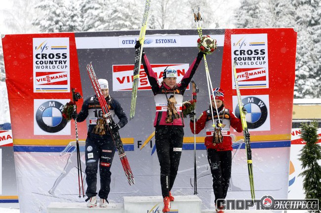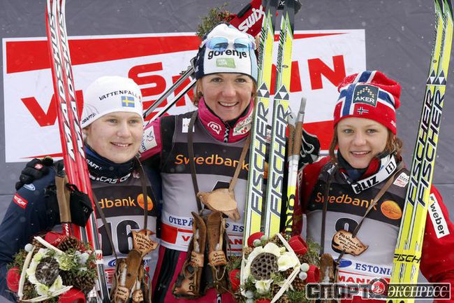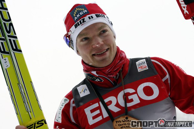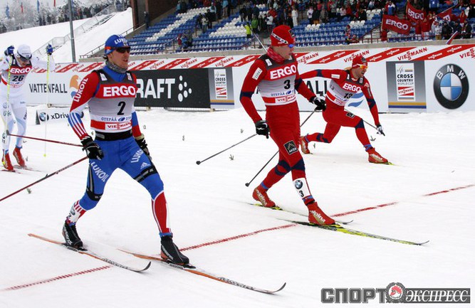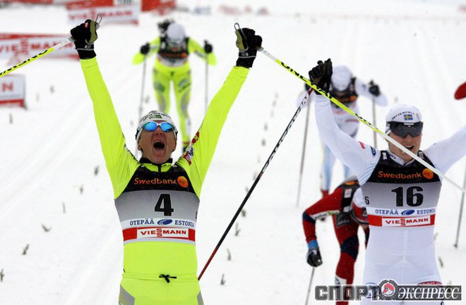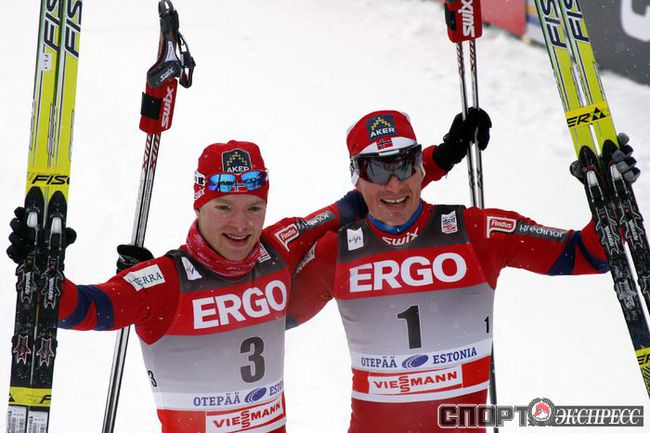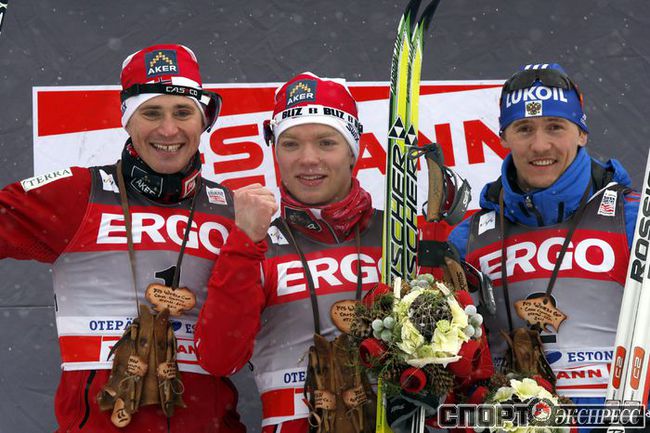 Лыжные гонки. Отепя (Эстония). Кубок мира. 7-й этап. Мужчины. Спринт (свободный стиль). Никита Крюков стал третим в гонке вслед за Ола-Виген Хаттестадом и Эриком Брансдалем из Норвегии. У женщин в кроссе победу одержала норвежка Петра Майдич. Фото AFP