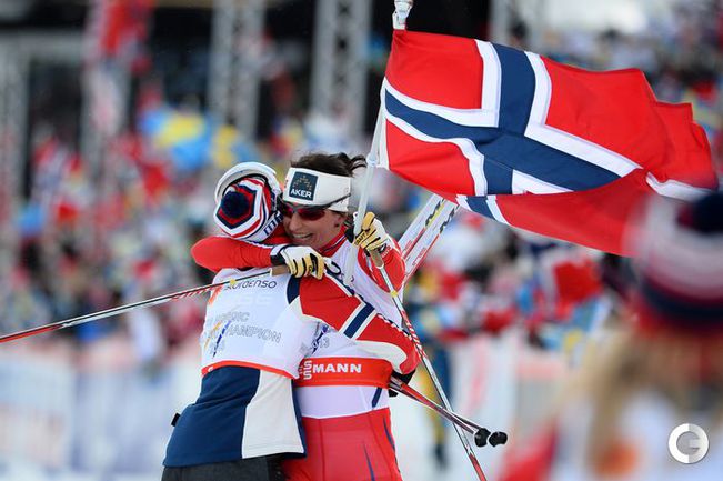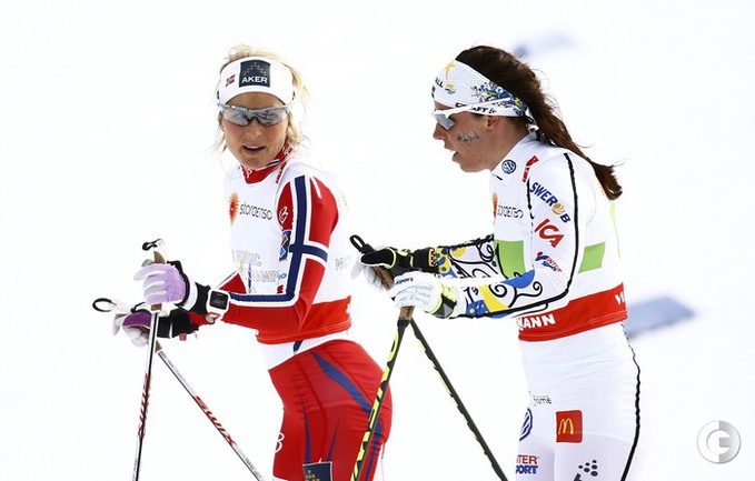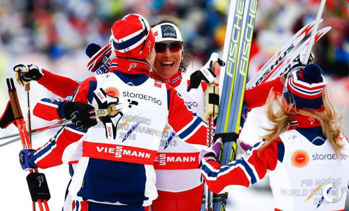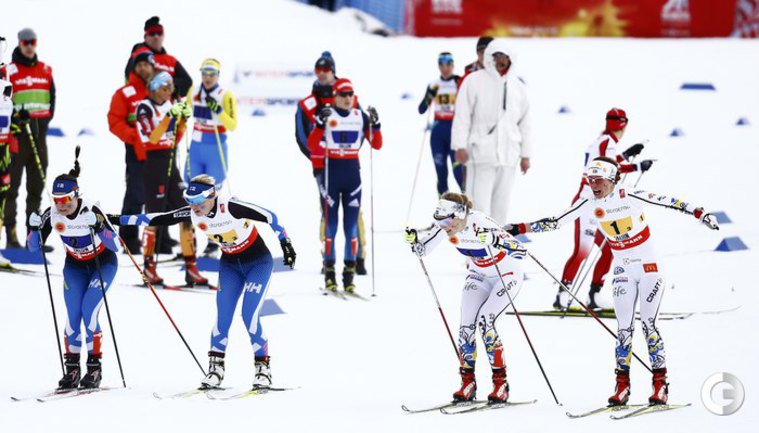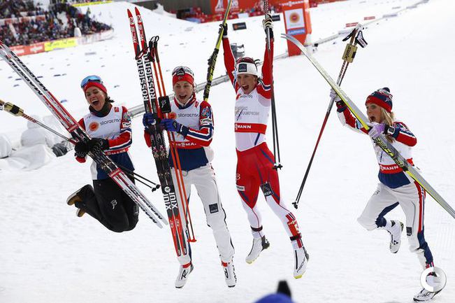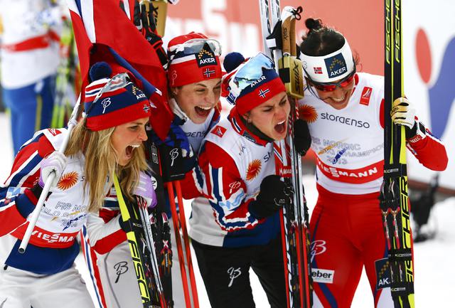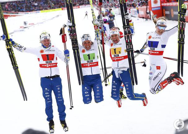 Лыжи. Фалун. Чемпионат мира. Женщины. Эстафета, 4 х 5 км. 1. Норвегия (Венг, Йохауг, Якобсен, Бьорген) – 49.04,7. 2. Финляндия (Сааринен, Нисканен, Ропонен, Пармакоски) – отставание 29,2. 3. Швеция (Блеккур, Калла, Рюдквист, Ст. Нильссон) – 30,8...7. РОССИЯ (ДОЦЕНКО, ТАНЫГИНА, ЖУКОВА, ЧЕКАЛЕВА) – 2.39,7. Фото AFP и REUTERS