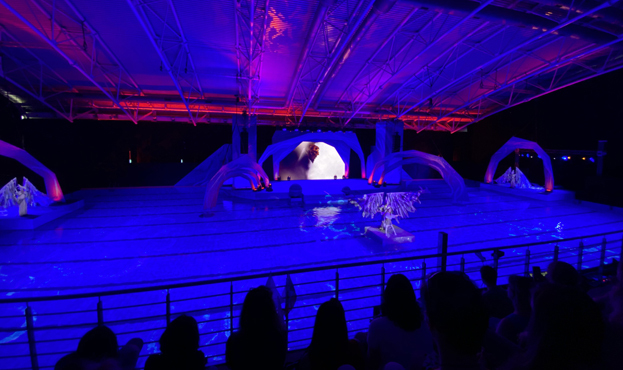 Постановка захватывающая и интересная, наполнена веселыми песнями и зажигательными танцами. Особенно бурно зрители реагировали на появление флайборда и прыгунов в воду, которые исполняли трюки с цирковых качелей. Отдельно отмечу чудовище из Ладожского озера, исполнившего смешную песню и сразу переставшего казаться таким страшным.