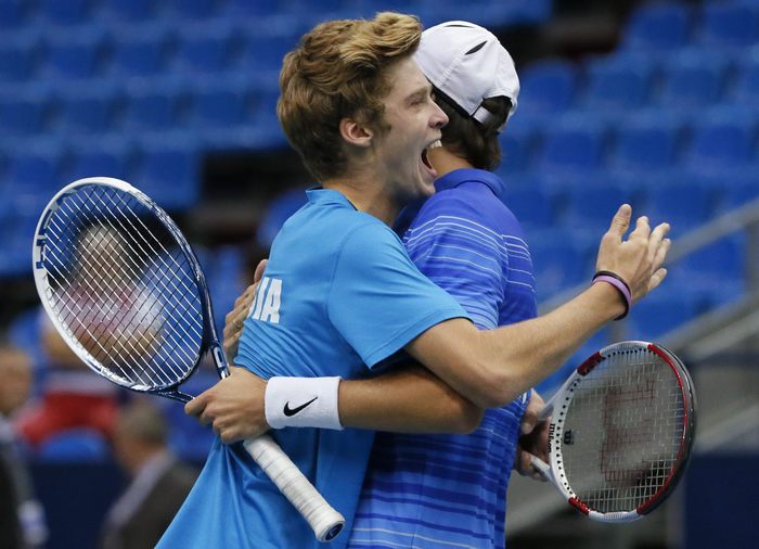 Сентябрь 2014 года. Андрей РУБЛЕВ (слева) и Константин КРАВЧУК после победы в парном поединке с португальцами в Кубке Дэвиса. Фото - REUTERS
