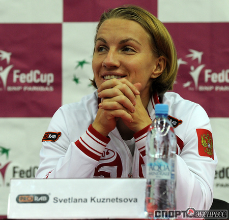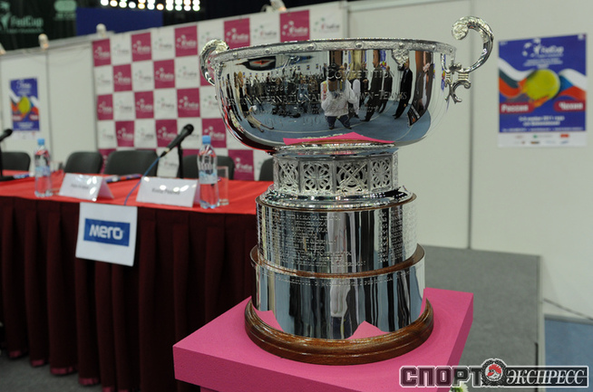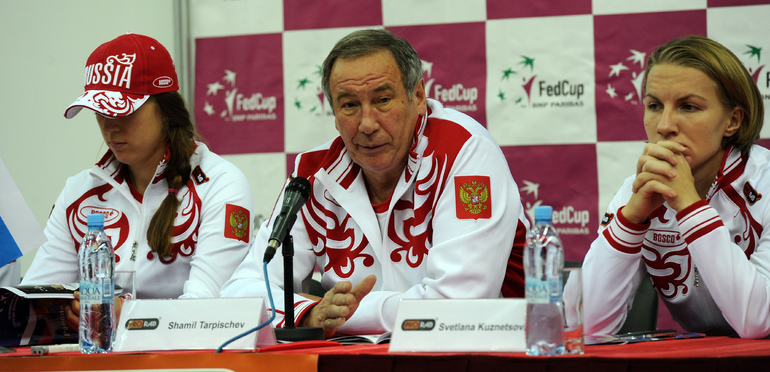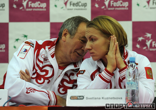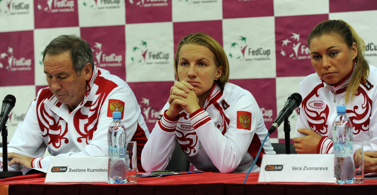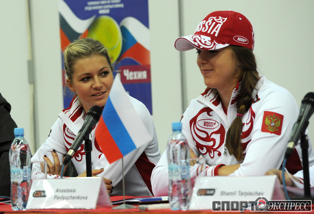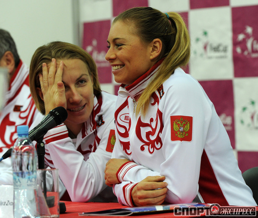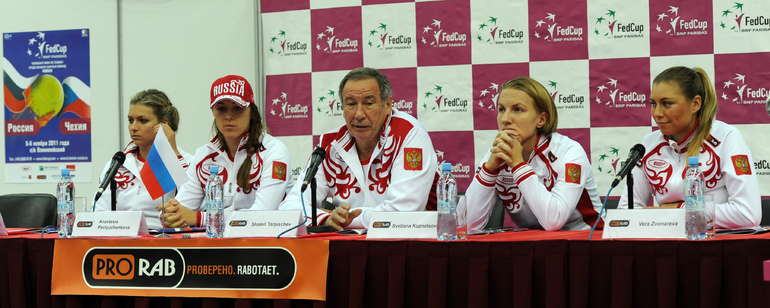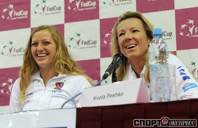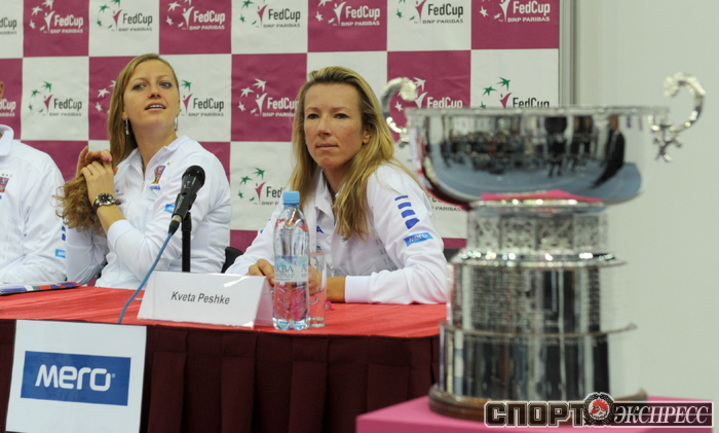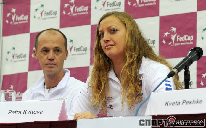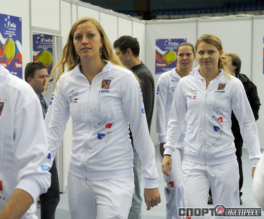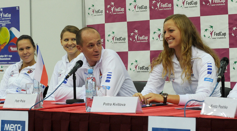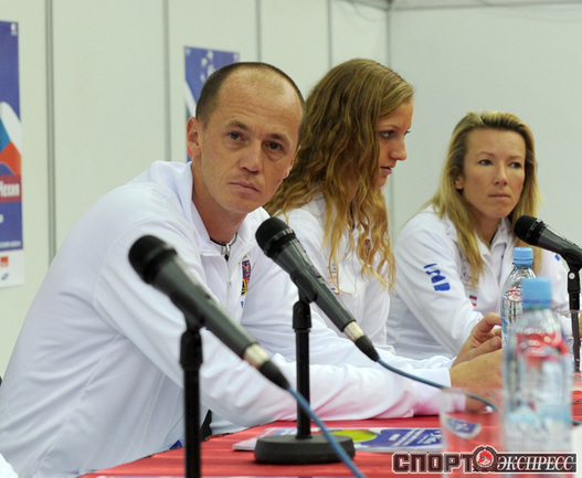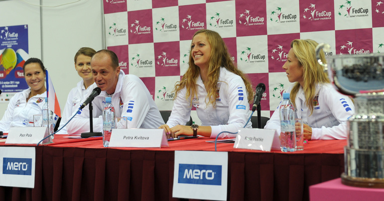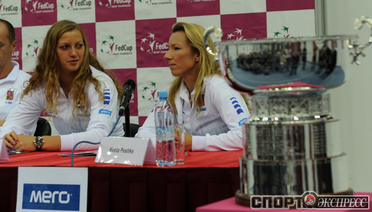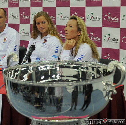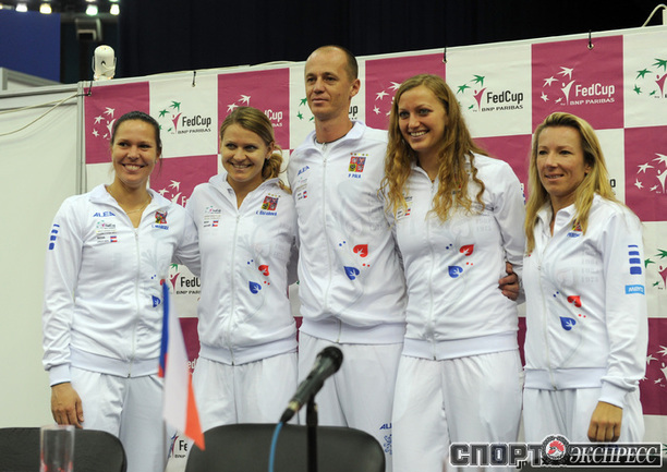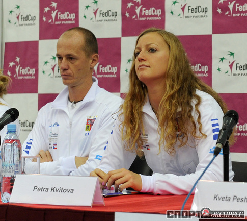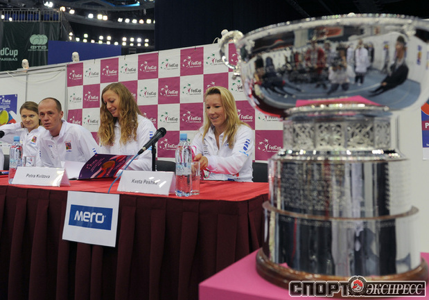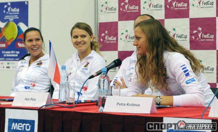 Сегодня капитан женской сборной Чехии Петр Пала и игроки его команды Петра Квитова, Квета Пешке, Люси Шафаржова и Люси Градечка дали пресс-конференцию, посвященную финалу Кубка федерации с Россией. Фото Татьяны ДОРОГУТИНОЙ, "СЭ"