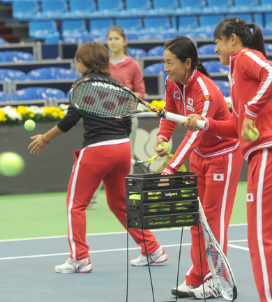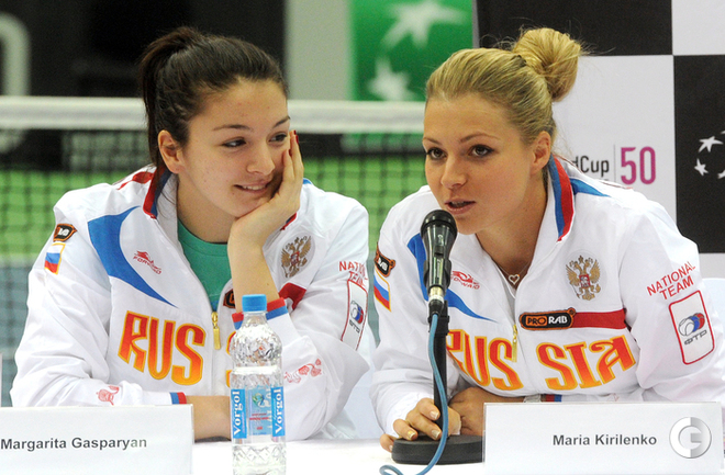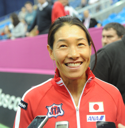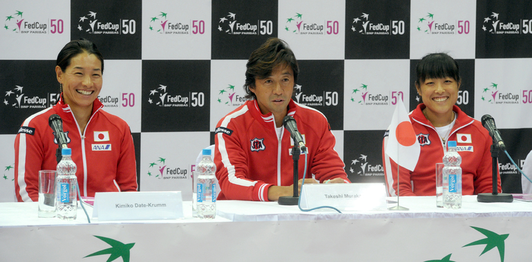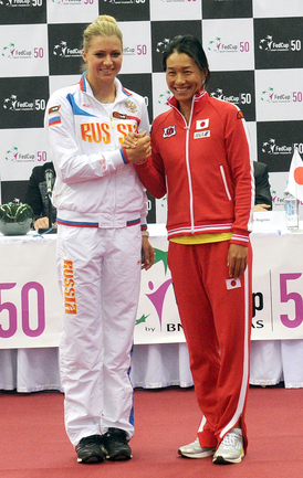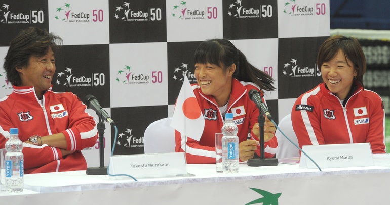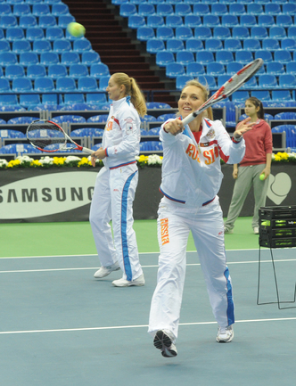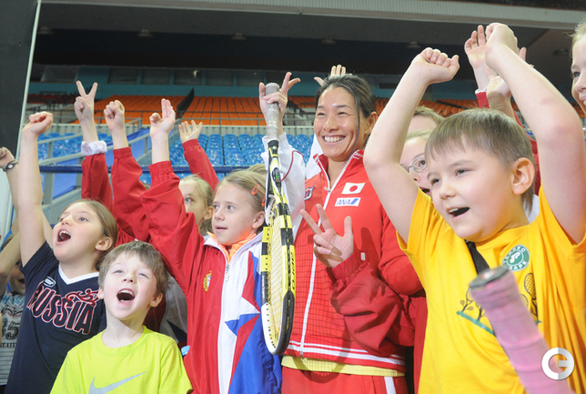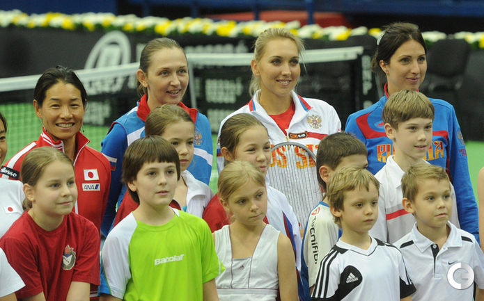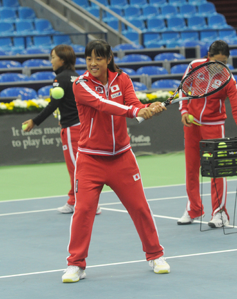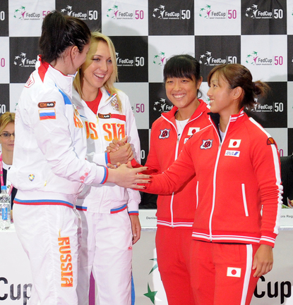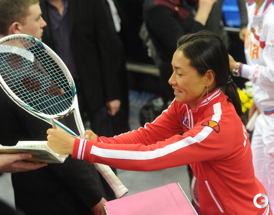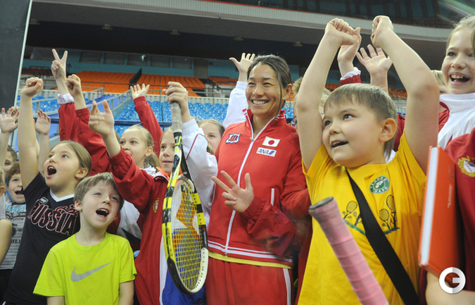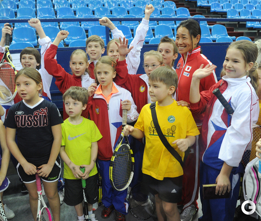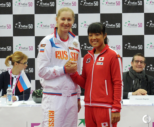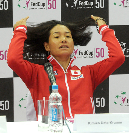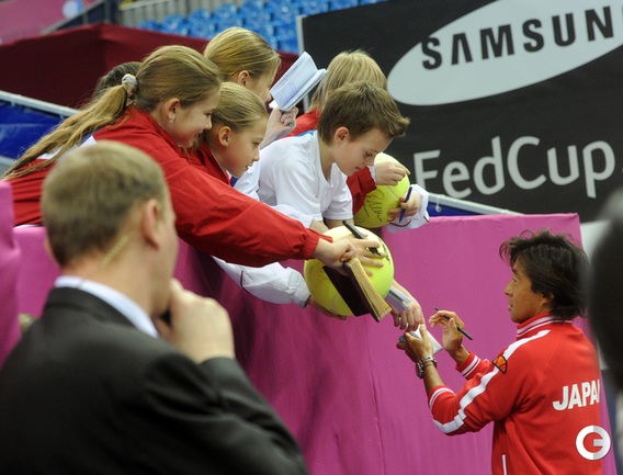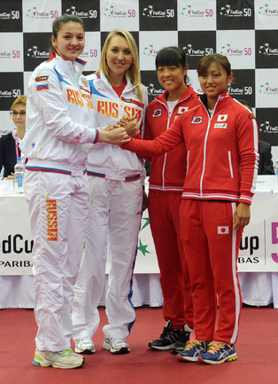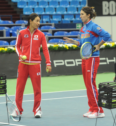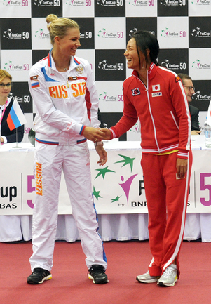 Теннис. Москва. Жеребьевка Кубка федерации. Мария Кириленко и Кимико Дате-Крумм сыграют в стартовом матче четвертьфинала Кубка федерации между сборными России и Японии, который стартует в субботу. После этих двух теннисисток на корт выйдут Екатерина Макарова и Аюми Морита. Фото - Татьяна Дорогутина, "СЭ"