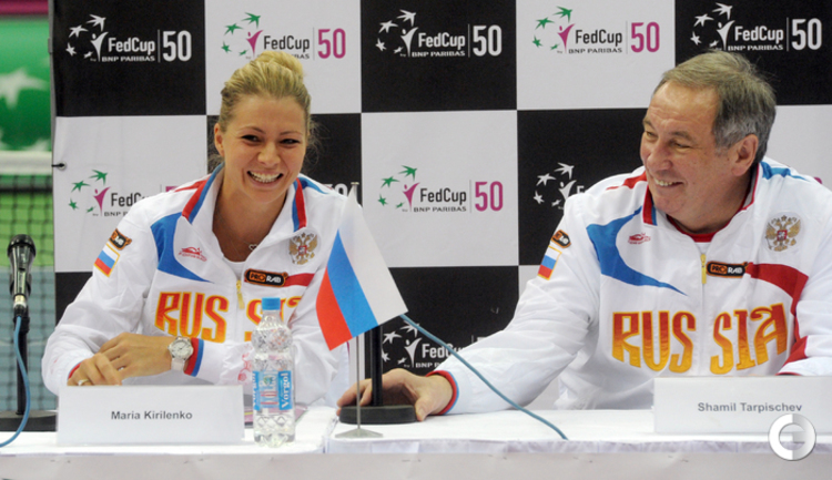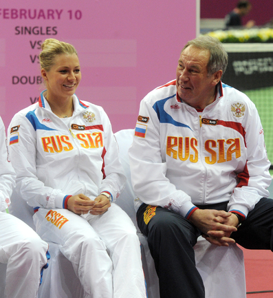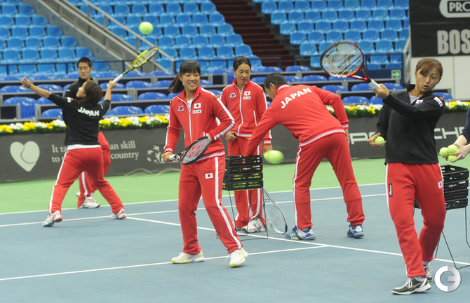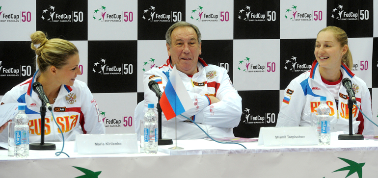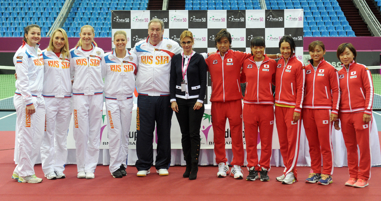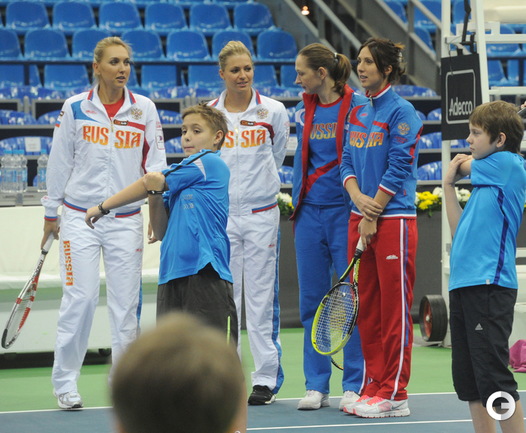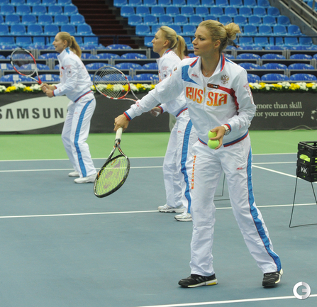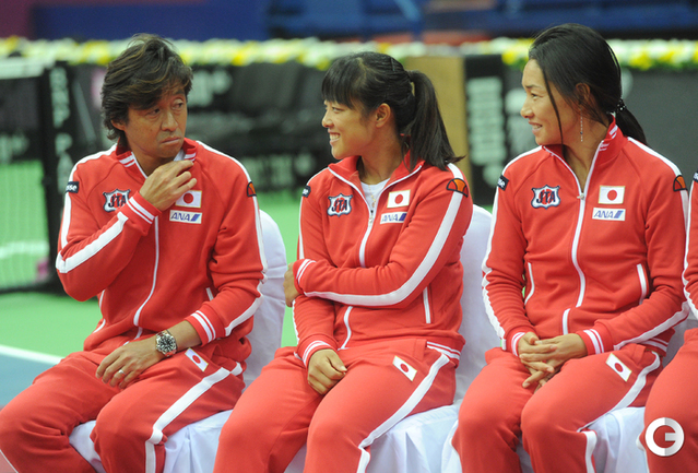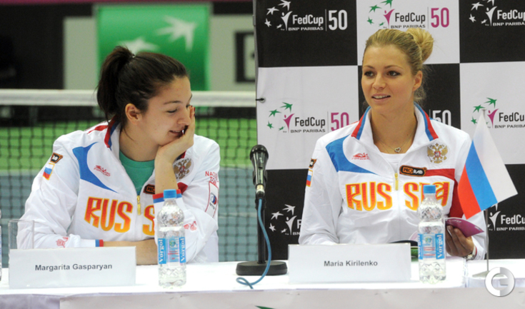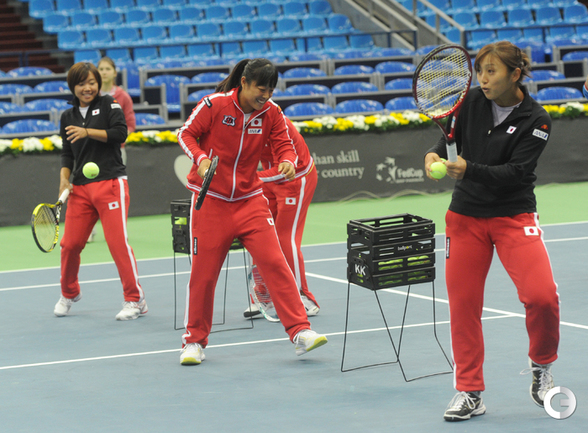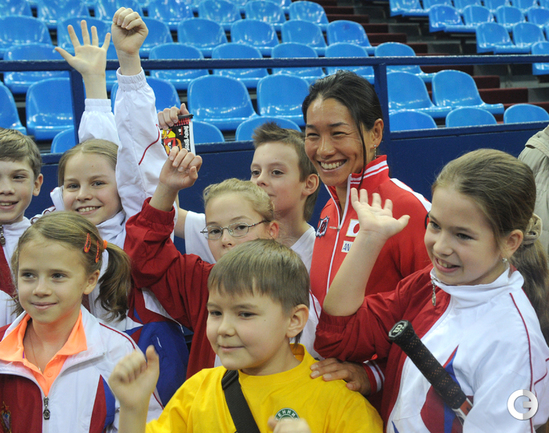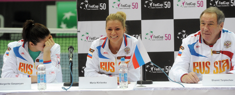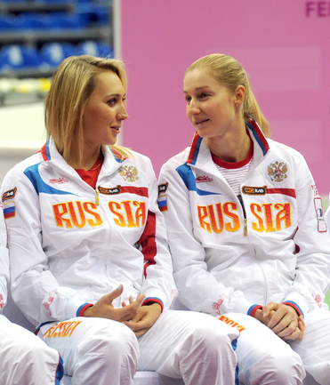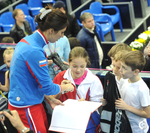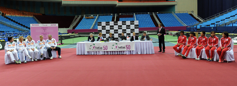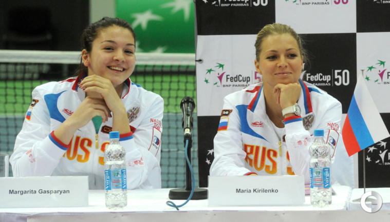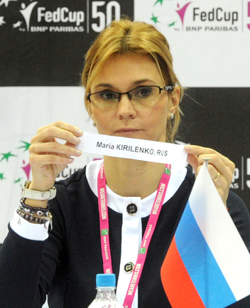 Теннис. Москва. Жеребьевка Кубка федерации. Мария Кириленко и Кимико Дате-Крумм сыграют в стартовом матче четвертьфинала Кубка федерации между сборными России и Японии, который стартует в субботу. После этих двух теннисисток на корт выйдут Екатерина Макарова и Аюми Морита. Фото - Татьяна Дорогутина, "СЭ"