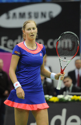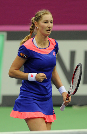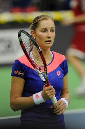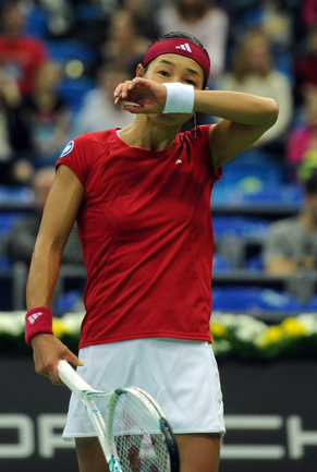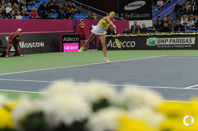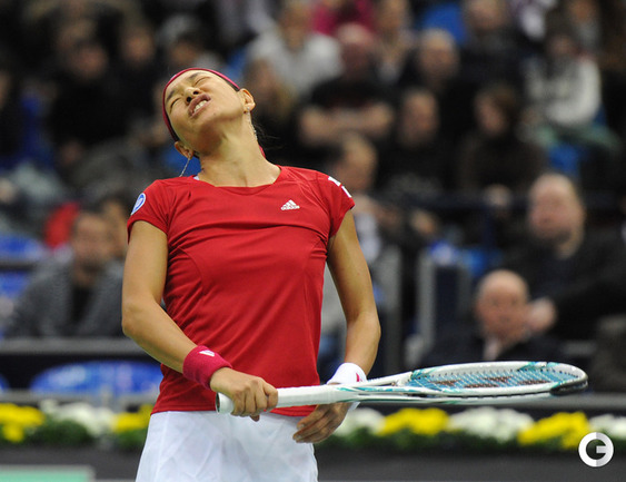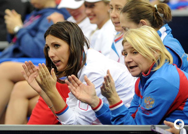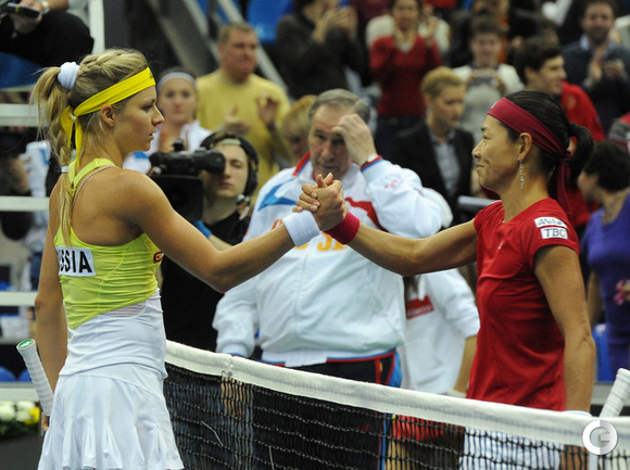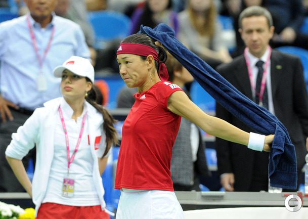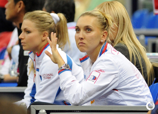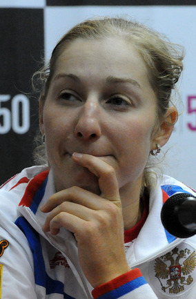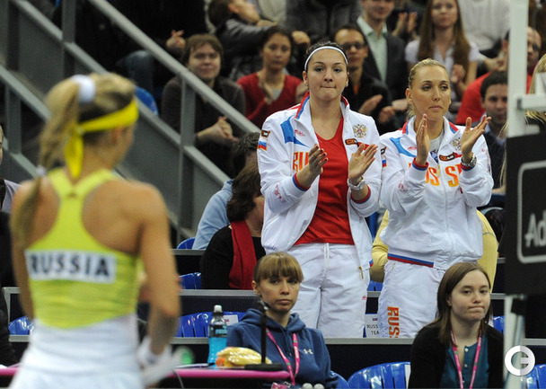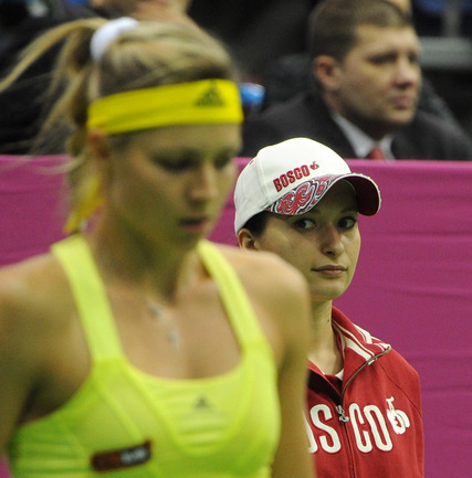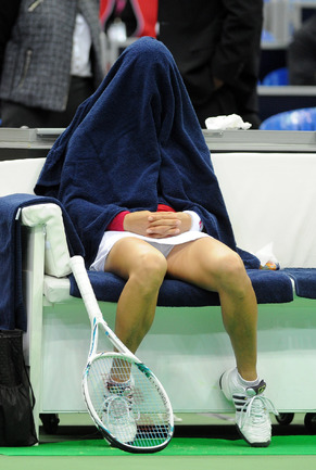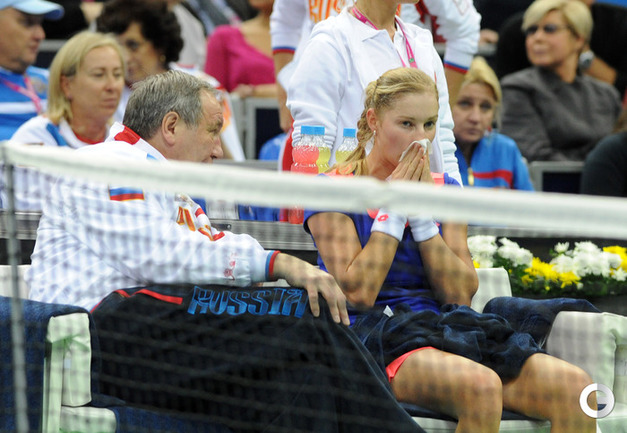 Теннис. Москва. Кубок федерации. 1/4 финала. Закрытый корт, хард. РОССИЯ - Япония - 1-1. КИРИЛЕНКО - Дате-Крумм - 7:6 (7:3), 6:4. МАКАРОВА - Морита - 2:6, 2:6. В конце второго сета Мария Кириленко из-за усталости взяла медицинский тайм-ау. Фото - Никита УСПЕНСКИЙ, "СЭ"