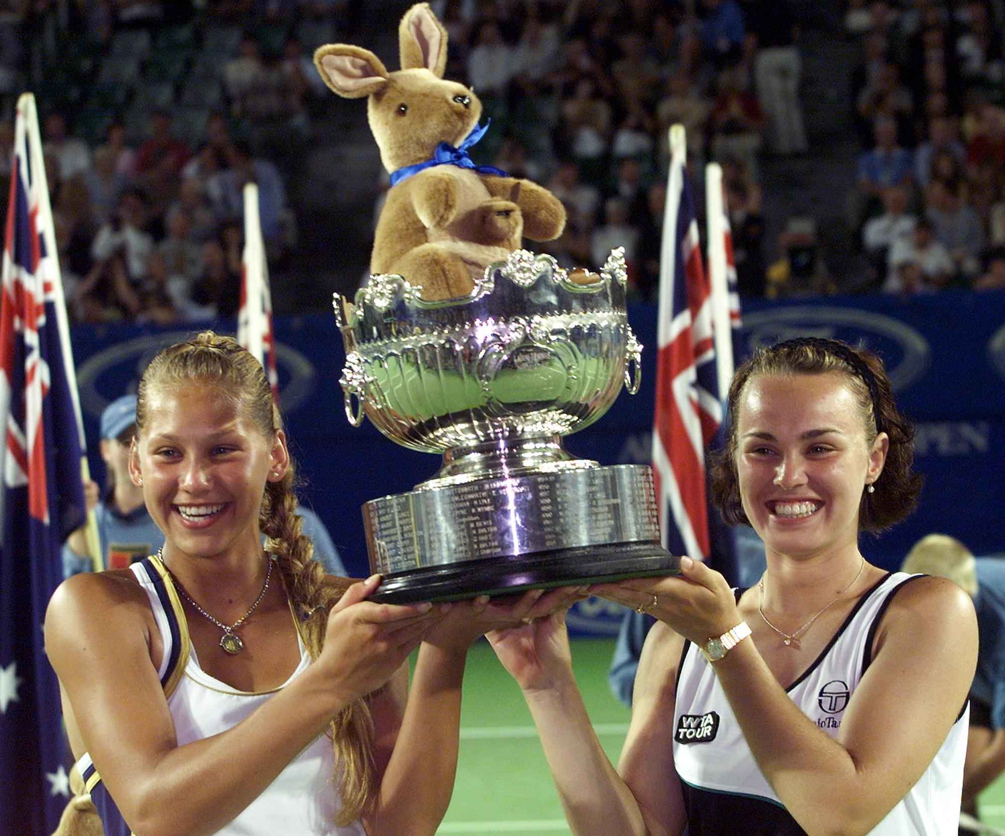 29 января 1999 года. Мельбурн. Анна КУРНИКОВА (слева) и Мартина ХИНГИС с кубком за победу
