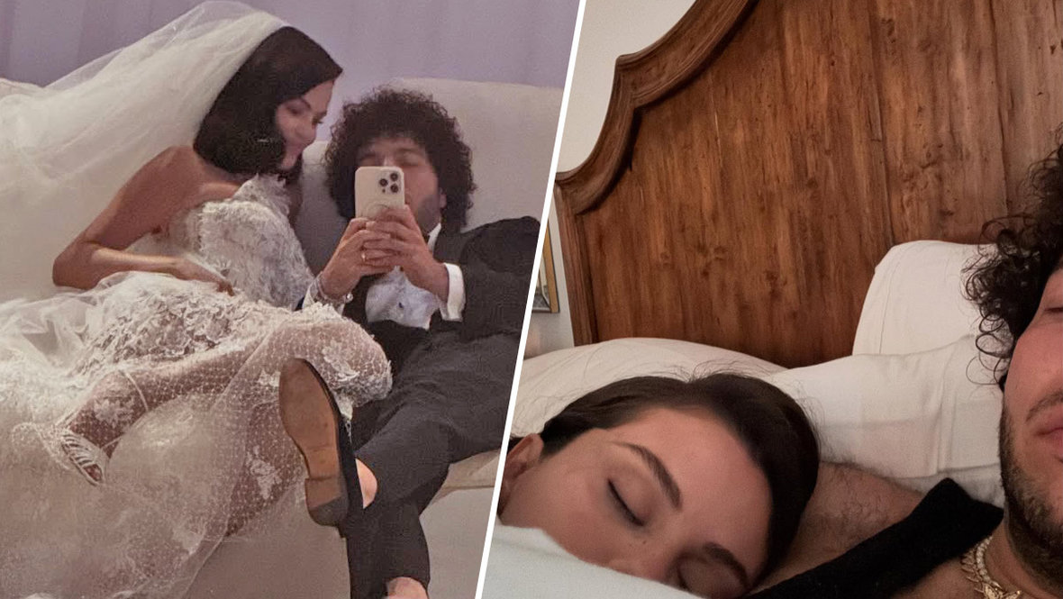 На одном из снимков пара позировала перед зеркалом. Артистка сидела в пышном свадебном платье и длинной фате, а Бенни — в белой рубашке с бабочкой и черном смокинге. На другом фото 33-летняя певица предстала спящей в кровати после церемонии.