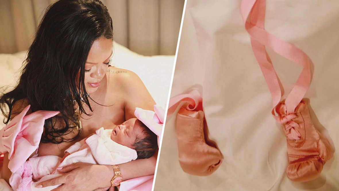 На одном из фото Рианна держит малышку на руках, ребенок укутан в розовый кокон. А на другом снимке на кремовой простыне лежат маленькие розовые боксерские перчатки с лентами такого же цвета.